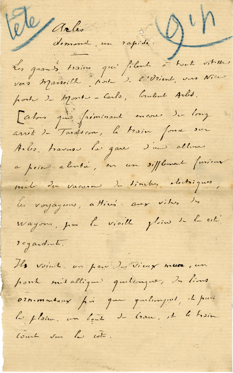 Manuscrit autographe signéManuscrit autographe signé, intitulé « Arles demande un rapide ». 11 pages in-8°. Chronique destinée à paraître dans le journal Le Siècle (?). « Les grands trains qui filent à toute vitesse, vers Marseille, porte de l’Orient,...