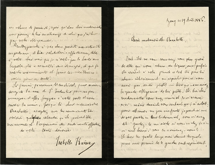 Lettre autographe signéeLettre autographe signée, adressée à Mlle Charlotte. « Zang, ce 19 août 1886 » ; 4 pages in-8° sur papier de deuil. ...