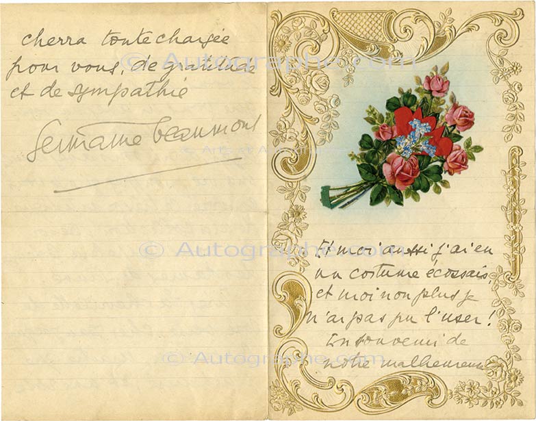 Lettre autographe signéeLettre autographe signée, adressée à Jean-Jacques Brousson. Sans date ; 2 pages 1/2 in-8° sur papier à lettre illustré d’une chromolithographie. « Et moi aussi j’ai eu un costume écossais et moi non plus je n’ai pas pu...