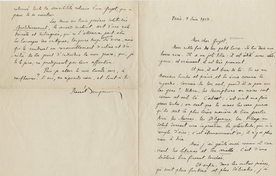 Lettre autographe signéeLettre autographe signée, adressée à Maurice Guyot. Paris, le 5 juin 1913 ; 1 page 1/2 in-8°. « Merci mille fois de ton petit livre. Je lui dois une heure rare. Il a un joli titre : il est écrit avec élégance, et vraiment il est...