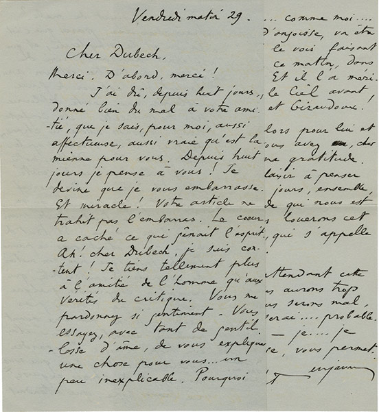 Lettre autographe signéeLettre autographe signée, adressée à Lucien Dubech. « Vendredi matin 29 » [1934 ?] ; 3 pages in-8°. « Merci, d'abord, merci ! [ ] Je devine que je vous embarrasse. Et miracle ! Votre article ne trahit pas l'embarras. Le cur a...
