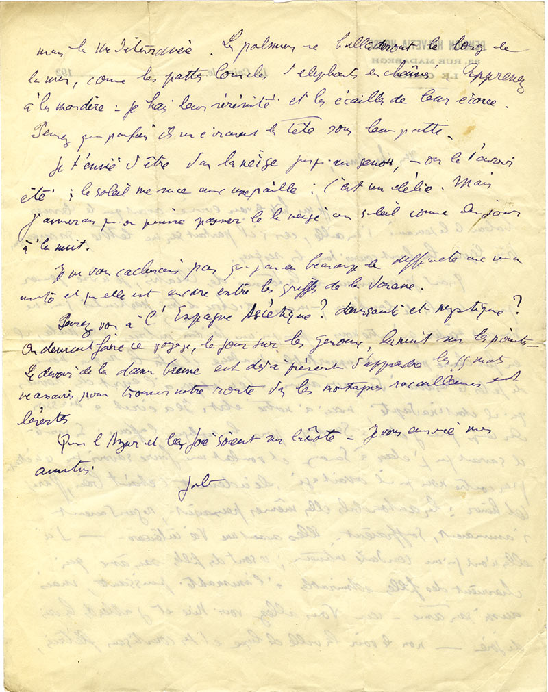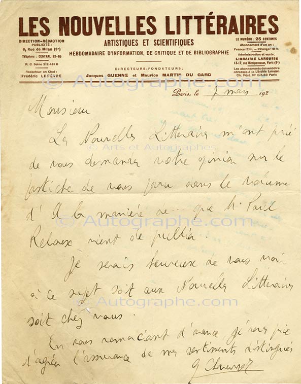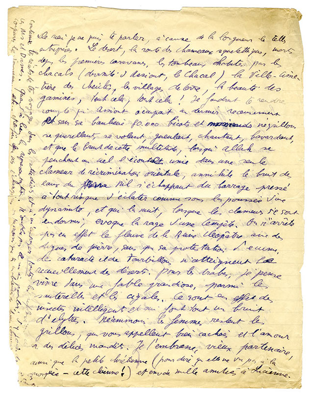 Lettre autographe signéeLettre autographe signée, adressée à Armand Salacrou. Sans date ; 2 pages in-4°. « Je me hâte de vous écrire avant que le dernier bateau de la semaine s’en aille, car s’il partait sans ma lettre, sa cargaison trop légère lui...
