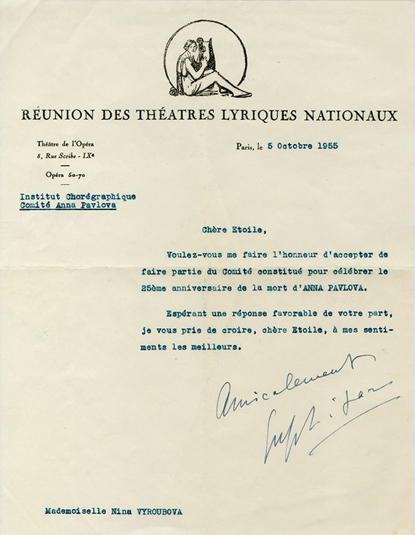 Lettre autographe signée, adressée àLettre autographe signée, adressée à Nina Vyroubova. Paris, le 5 octobre 1955 ; 1 page in-4°. En tête imprimé « Réunion des Théâtres Lyriques Nationaux ».« Voulez-vous me faire lhonneur daccepter de faire partie du Comité...