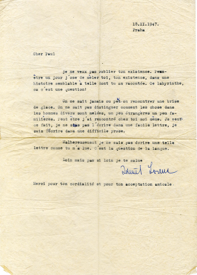 Lettre signéeLettre signée, adressée à M. Paul Bourgoignie. Prague, 18 novembre 1947 ; 1 page in-4°, en français, enveloppe jointe. « Je ne veux pas oublier ton existence. Peut-être un jour j’ose de mêler toi, ton existence, dans une histoire...