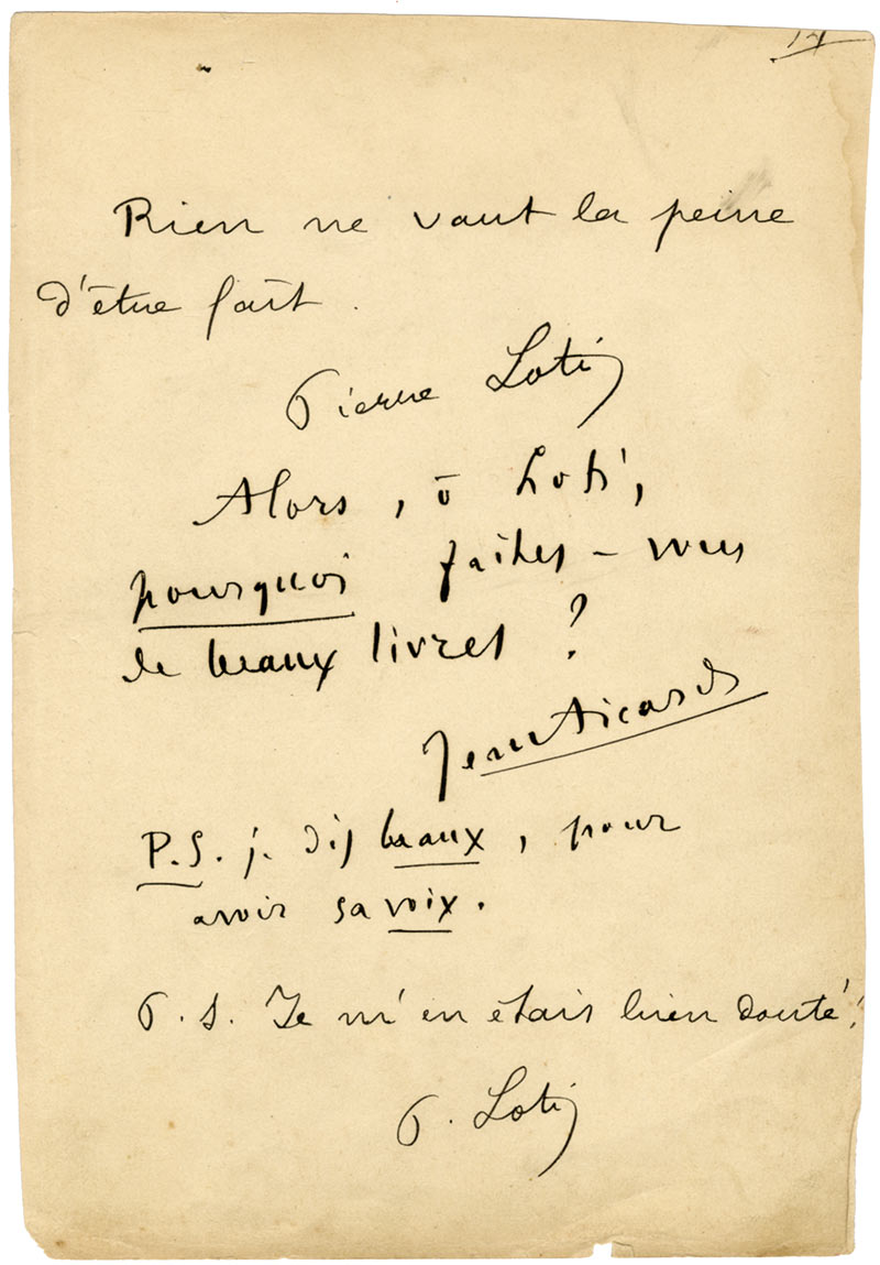 Pièce autographe signéePièce autographe signée. [Vers 1909] ; 1 page in-8°.« Rien ne vaut la peine d’être fait. Pierre Loti. »En dessous Jean Aicard répond = « Alors, Ô Loti, pourquoi faites-vous de beaux livres ? Jean Aicard.Je dis beaux, pour...