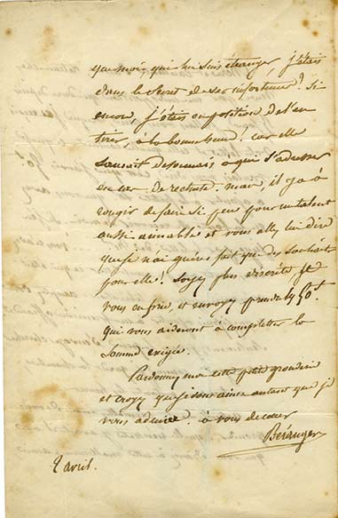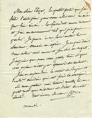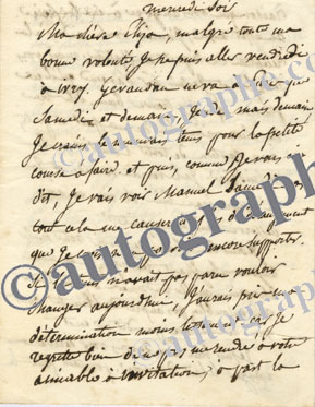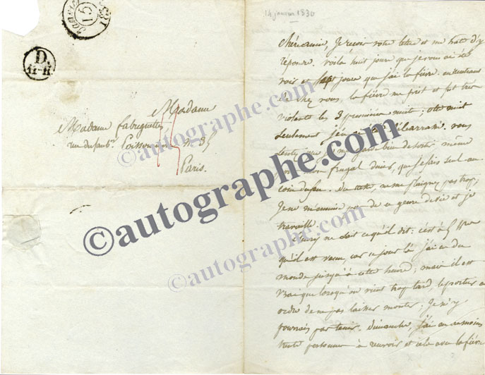 Lettre autographe signéeLettre autographe signée, adressée à Mme Fabreguettes. [14 janvier 1830] ; 2 pages in-8°, adresse sur le 4e feuillet. « Voilà huit jours que je vous ai été voir et sept jours que j’ai la fièvre. En rentrant de chez vous, la...