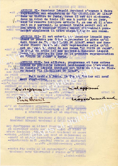 Pièce signéePièce signée. Paris, 13 février 1925 ; 2 pages in-4°.Contrat signé par Pierre Benoît et Léopold Marchand par lequel Pierre Benoît accorde à Léopold Marchand le droit de tirer une pièce en plusieurs actes, de son roman La...