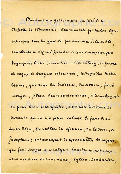Manuscrit autographe signéManuscrit autographe signé. Alexandrie, 10 septembre 1924 ; 2 pages in-8°. Extrait de « Le Puits de Jacob, chapitre VIII ». Cette page faisait partie d’un carnet de dédicaces autographes signées de personnalités artistiques et...