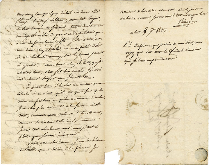 Lettre autographe signéeLettre autographe signée, adressée à Mme Fabreguettes. 8 janvier 1827 ; 2 pages 1/2 in-8°, adresse avec marques postales. «Vous faites bien de prendre mon habitude et d'écrire quand vous voyagez. Cela m'a valu une jolie lettre bien...