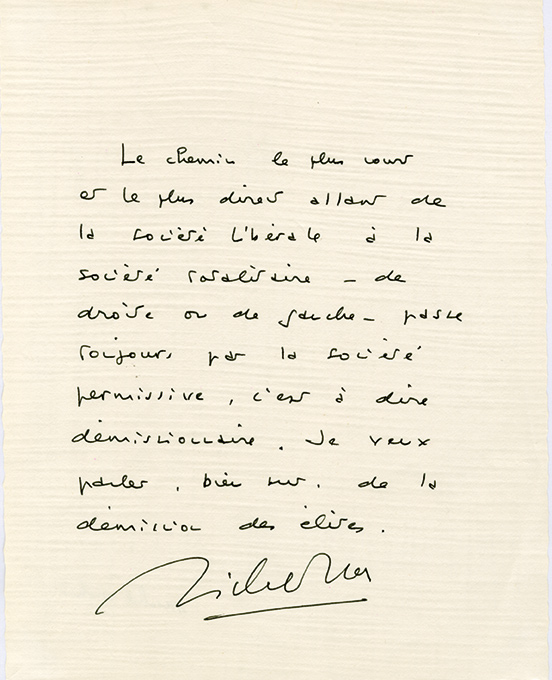 Pensée autographe signéePensée autographe signée. Sans date ; 1 page in-4°. « Le chemin le plus court et le plus direct allant de la société libérale à la société totalitaire — de droite ou de gauche — passe toujours par la société permissive,...