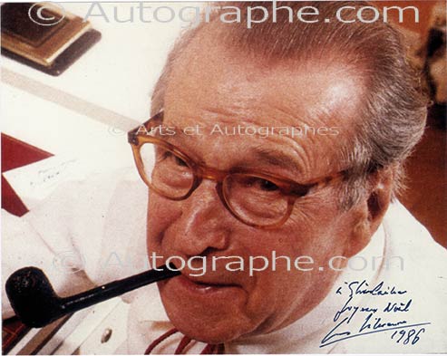 Photographie dédicacéePhotographie dédicacée. 1986 ; 175 X 135 mm. Portrait en couleurs dédicacé : « À Ghislaine, Joyeux Noël. G. Simenon. 1986.»