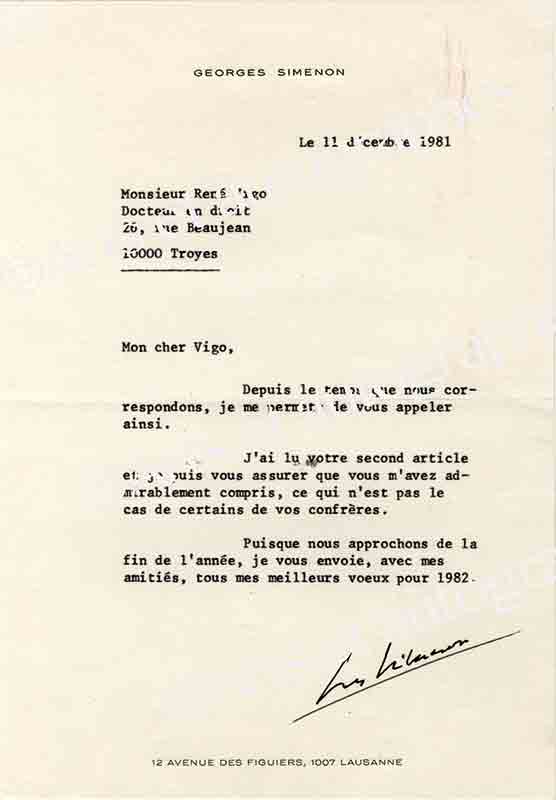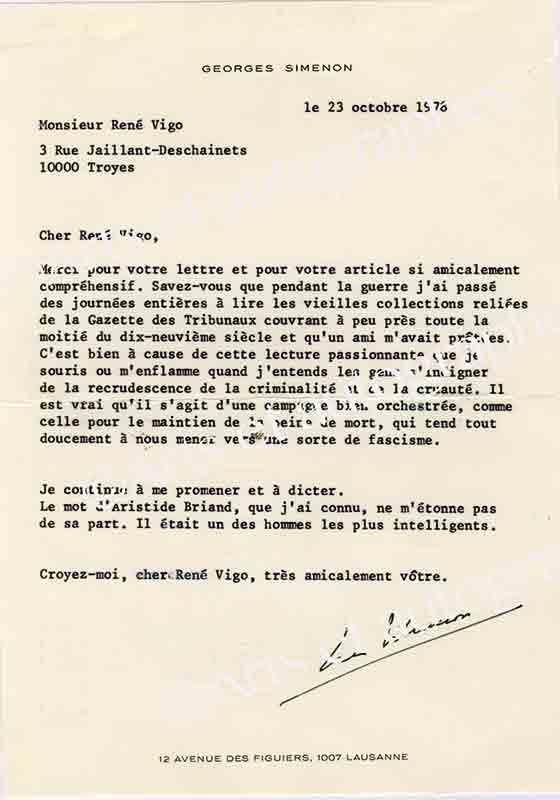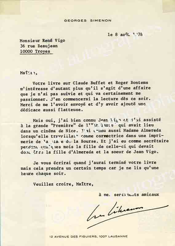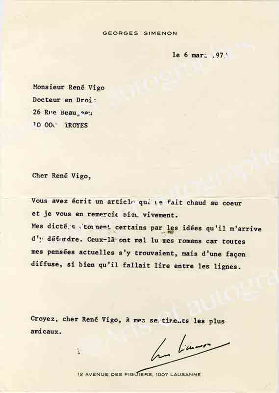 Lettre signée et carte autographe signéeLettre signée et carte autographe signée, adressées à René Vigo :— 23 octobre 1978 ; 1 page in-8° , sur son papier à lettre, enveloppe timbrée jointe. « Cher René Vigo, merci pour votre lettre et votre article si aimablement...