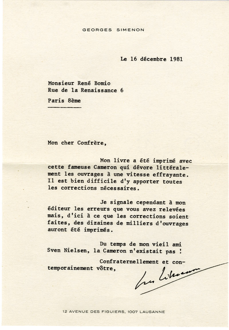 Lettre signéeLettre signée, adressée à René Brest. Lausanne, le 16 décembre 1981 ; 1 page in-8°, avec enveloppe. « Mon livre a été imprimé avec cette fameuse Cameron qui dévore littéralement les ouvrages à une vitesse effrayante. Il est...
