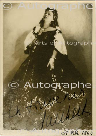 Photographie dédicacéePhotographie dédicacée. 16,5 x 11,5 cm, traces d’émulsion dans la partie inférieure.« En souvenir, Clairbert. 31 mai 1944 » Portrait sépia en pied dans le rôle de Violetta (La Traviata), arborant une longue robe noire et...
