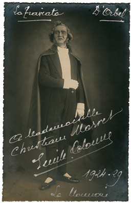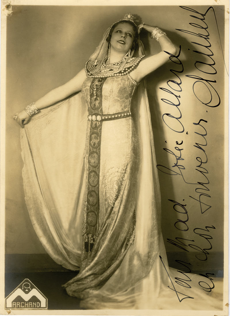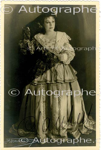 Photographie dédicacéePhotographie dédicacée. 21,5 x 15,5 cm. « Pour Mad. Josée Allard en bon souvenir, Clairbert. » Portrait en pied dans le rôle d’Esclarmonde, le bras gauche contre sa tempe et l’autre bras tenant sa cape, arborant de superbes...