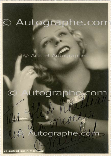 Photographie dédicacéePhotographie dédicacée. 21,5 x 15,5 cm. « Pour Elise Rousseau, en bon souvenir, Clairbert. » Portrait en buste, de face, la tête appuyée contre une colonne noire, exhibant ses bijoux et souriant en tenue de ville. Photographie de R....