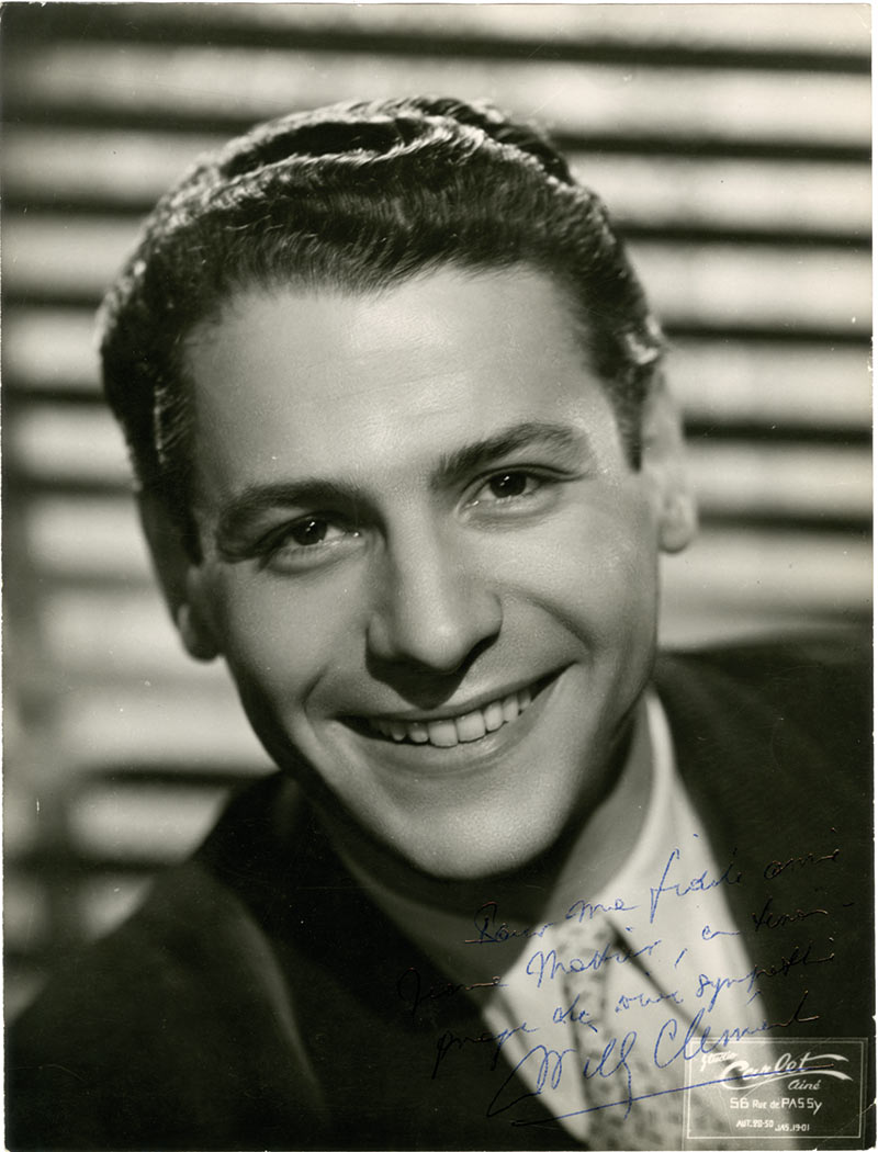 Photographie dédicacéePhotographie dédicacée. 24 x 18 cm. Cliché du studio Carlet, Paris.« Pour ma fidèle amie Jeanne Mottier, ce message de vive sympathie, Willy Clément. »
