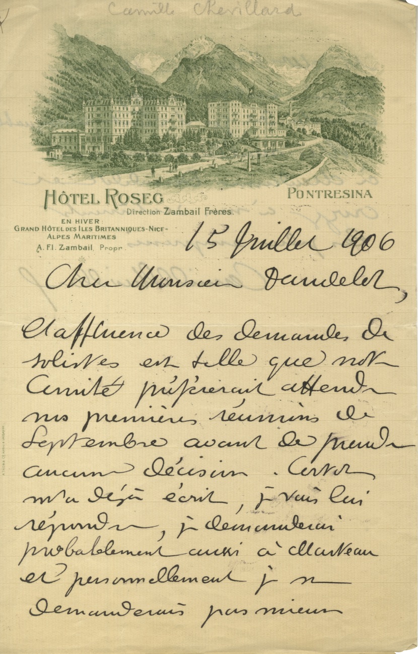 Lettre autographe signéeLettre autographe signée adressée au critique et agent artistique Arthur Dandelot. 15 Juillet 1906 ; 1 page 1/2 in-8°, sur papier en-tête illustré de l’hotel Roseg à Pontresina en Suisse. ...