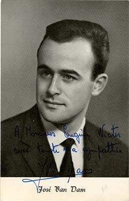 Photographie signéePhotographie signée. 14 x 9 cm. Photographie jeune. « À Monsieur Eugène Wiater avec toute ma sympathie J. Van Dam. »