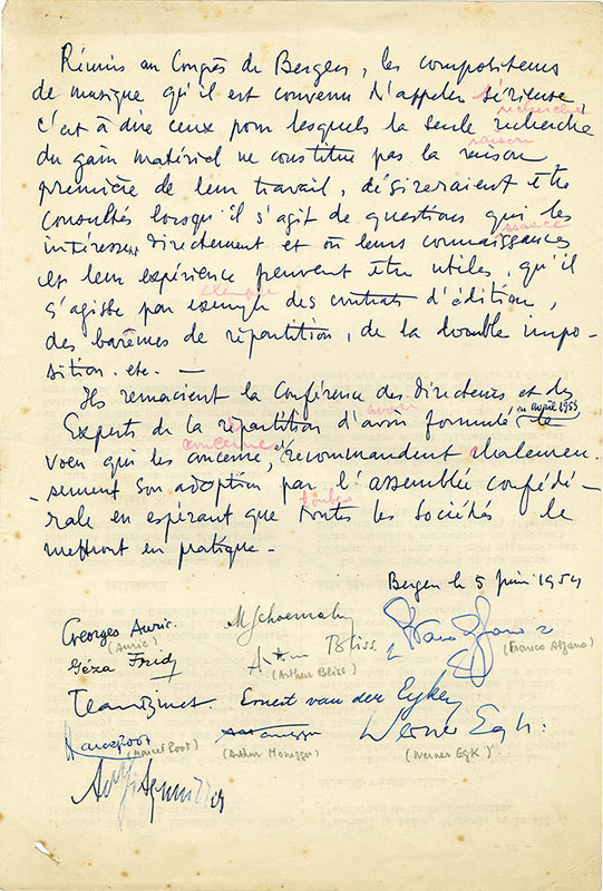 Pièce signéePièce signée par de nombreux musiciens dont : Arthur Honegger, Georges Auric, Arthur Bliss, Werner Egk, Marcel Poot, Jean Binet, Franco Alfano, Géza Frid, Ernest Van der Eyken, Maurice Schoemaker, etc. Bergen, 5 juin 1954 ; 1 page...