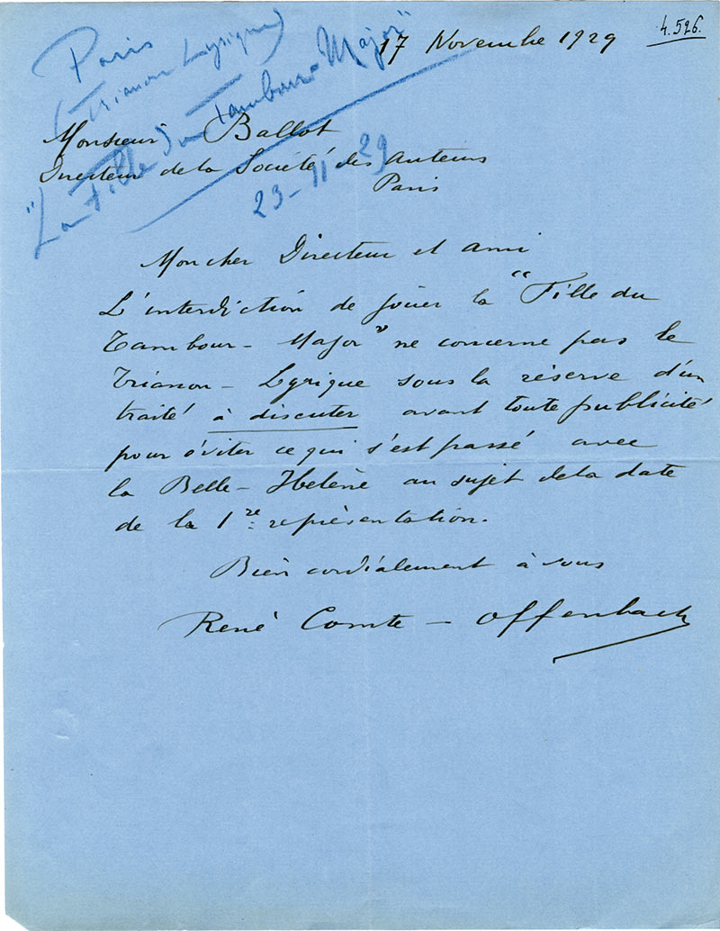 Ensemble de 2 lettres autographes signéesEnsemble de 2 lettres autographes signées concernant un accord pour jouer la “Fille du Tambour-Major” au Trianon lyrique en 1929.La Fille du tambour-major est un opéra-comique de Jacques Offenbach, en 3 actes et 4 tableaux, sur un...