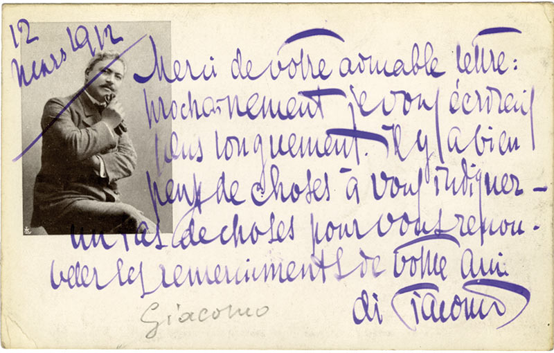 Carte autographe signéeCarte autographe signée, adressée à M. André Maurel. 12 mars 1912 ; 1 page in-12 oblongue (carte photographique avec son portrait), adresse timbrée au dos. « Merci de votre aimable lettre : prochainement je vous écrirai plus...