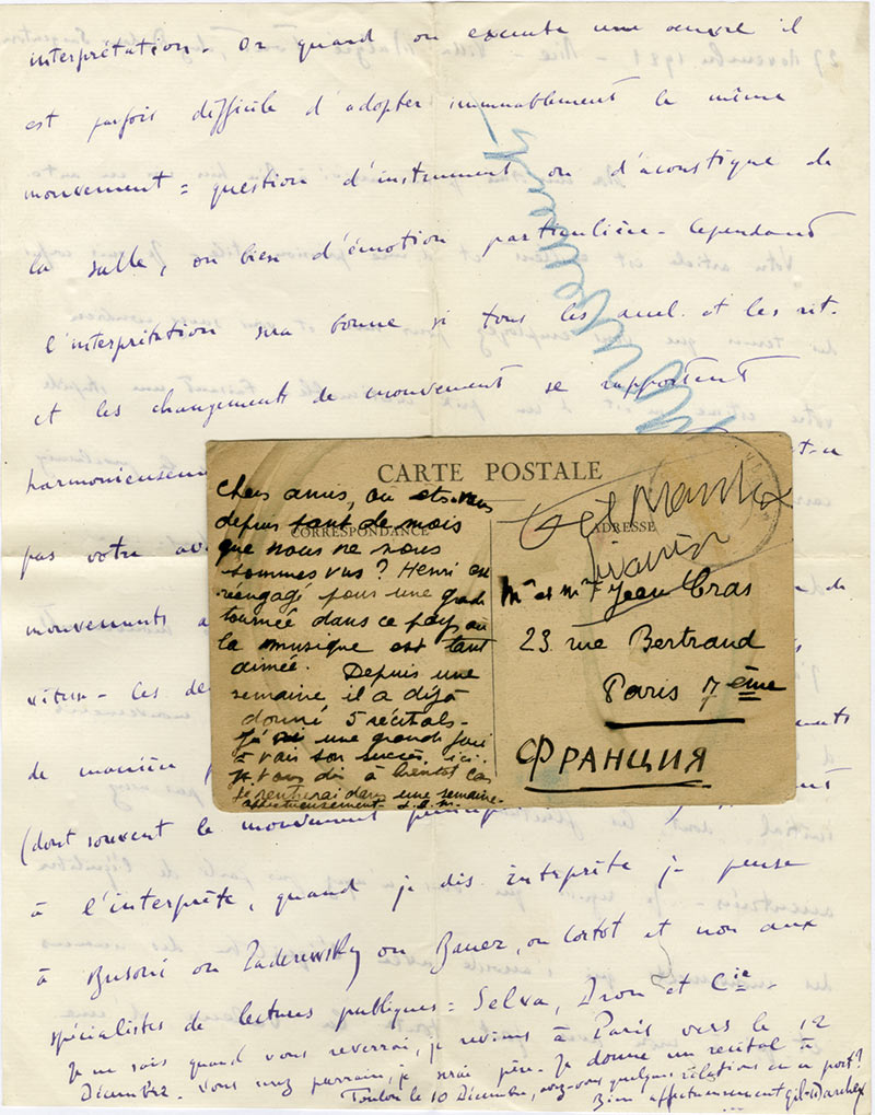 Lettre autographe signéeLettre autographe signée [adressée à Jean Cras]. 27 novembre 1921 ; 2 pages in-4°.« Votre article est excellent et d’une précision utile. je suis confus des termes que vous employez pour moi et vous savez combien votre estime...