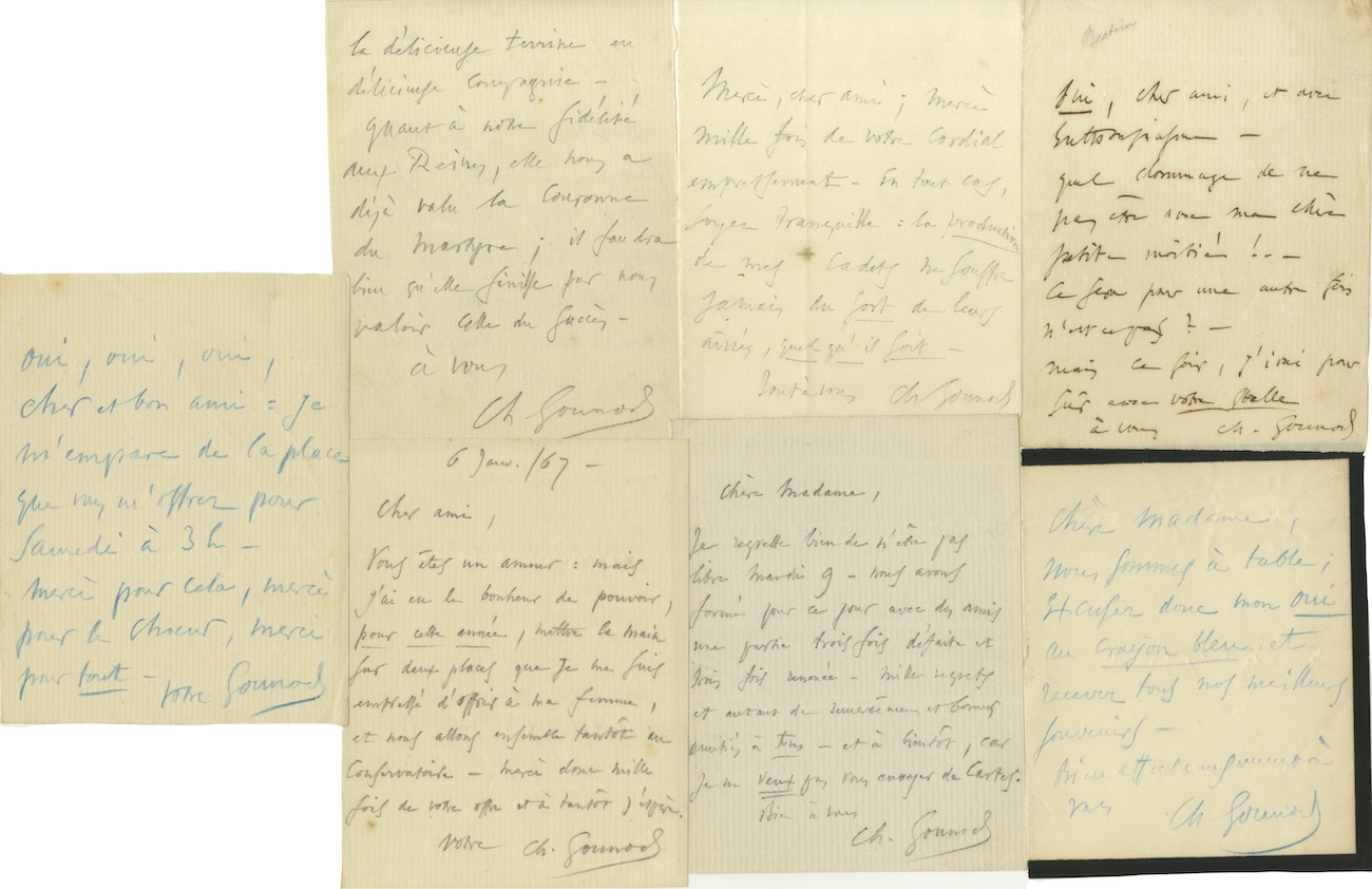 7 billets autographes signés7 billets autographes signés adressée à des amis. 6 janvier 1867 et sans date ; 1 page in-16° chacun, à l’encre ou au crayon de papier ou crayon bleu. ...