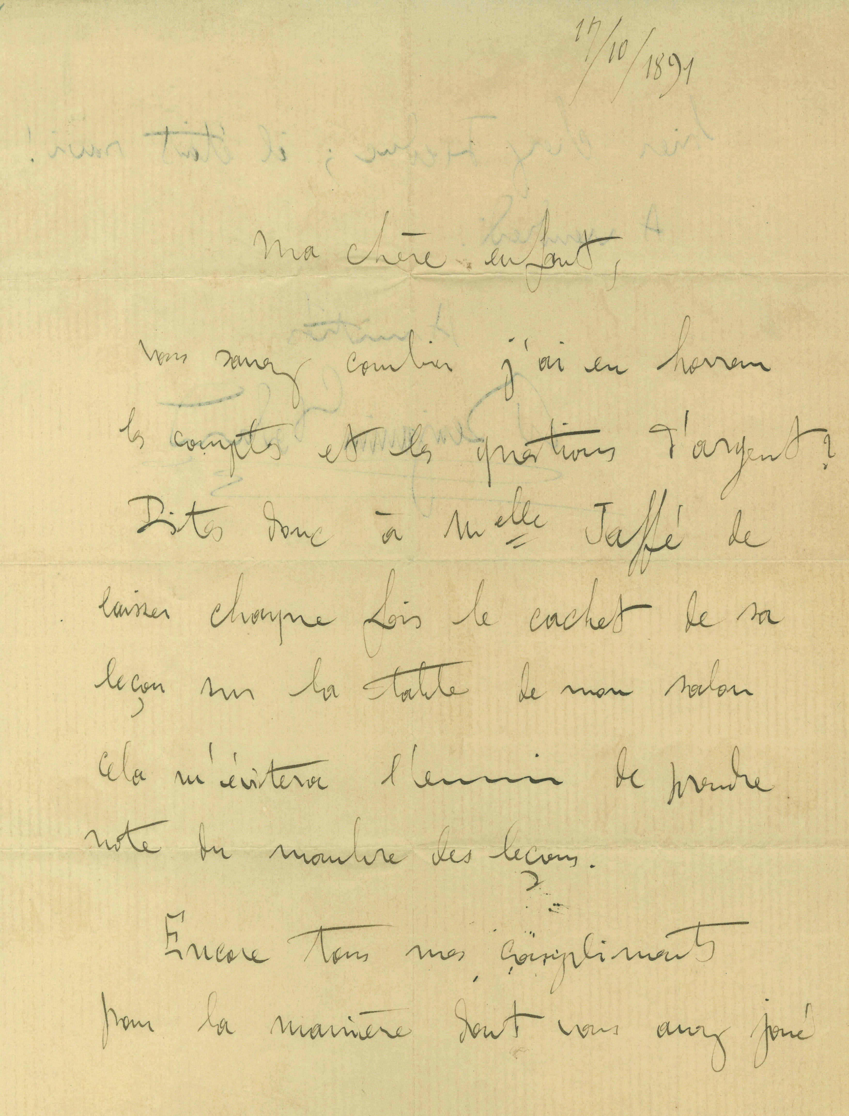 Lettre autographe signéeLettre autographe signée adressée à un de ses élèves. 17 octobre 1891 ; 1 page1/2 in-4°. ...