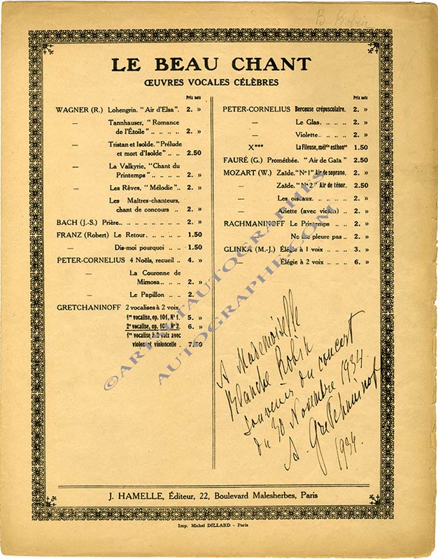 Envoi autographe signéPartition imprimée avec envoi autographe signé à Mlle Blanche Robin. Éditions J. Hamelle, 1926 ; 275 X 350 mm. Partition de son œuvre « 2 vocalises à 2 voix » (2e vocalise, op. 101, n°2). « À Mademoiselle Blanche Robin souvenir...