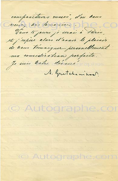 Lettre signéeLettre signée. Saint-Pétersbourg, 16 février 1911 ; 1 page 1/2 in-8°, en français. « Mon cher Maître, agréez le témoignage de ma plus profonde reconnaissance pour l’embarras que vous avez eu à cause de mon opéra Sœur Béatrix....