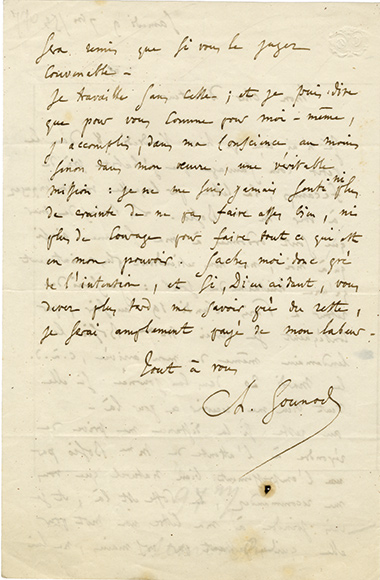 Lettre autographe signéeLettre autographe signée, adressée à « mon cher Directeur » [Nestor Roqueplan, directeur de l’Opéra]. Samedi 9 septembre 1853 ; 2 pages in-8°.Il réside actuellement « dans un petit coin sauvage […] près de Fécamp. Les bains...