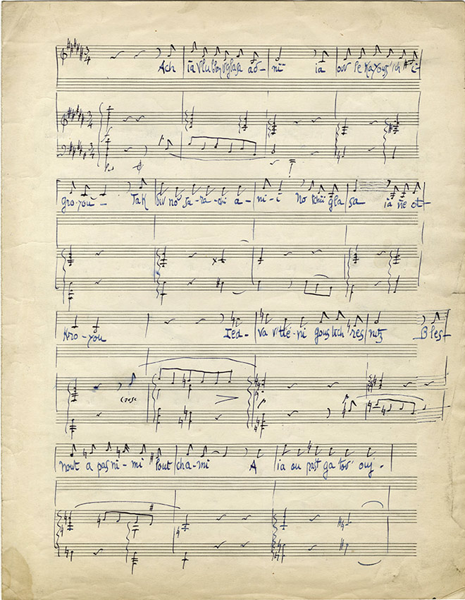 Manuscrit musical autographeManuscrit musical autographe. [Monte Carlo, 1944] ; 2 pages et demie in-folio.Chanson russe : « Ach ia Vlu blon vglasa adnï » Transcription musicale pour chant et piano, en si majeur à 3/4, en 28 mesures, marquée dune autre...