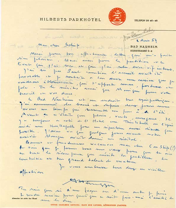 Lettre autographe signéeLettre autographe signée adressée à Marcel Mihalovici. 2 août 1954 ; 1 page in-4°, enveloppe jointe. Sur papier à en-tête du Hilberts Parkhotel.« Mon cher Schip, merci pour ton affectueuse lettre qui m’a fait bien plaisir. Merci...