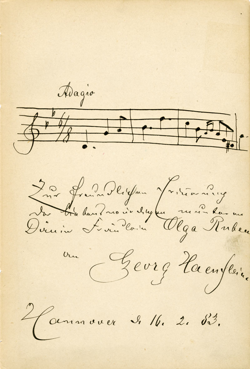 Porté musicale autographe signéePortée musicale autographe signée, dédicacée à Olga Ruben. Hannover 16 février 1883 ; 1 page in-12. On joint un poème à la même dame, Olga Ruben, signé « S. Coppel ». 1883.