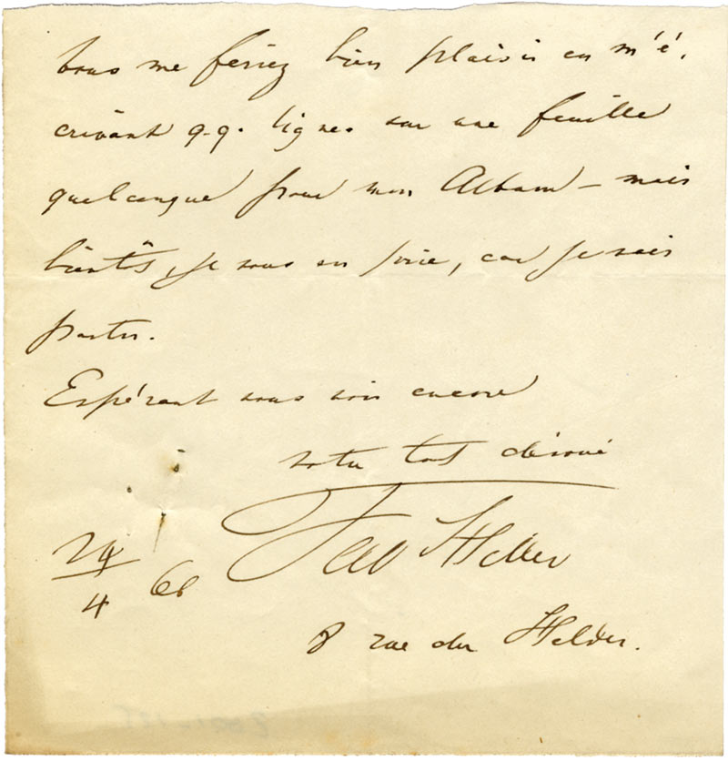 Lettre autographe signéeLettre autographe signée, adressée à Félix Lecouppey. 24 avril 1868 ; 1 page in-16 carrée, en français. « Vous me feriez bien plaisir en m’écrivant q.q. lignes sur une feuille quelconque pour mon album. »