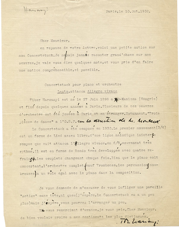 Lettre signée avec corrections autographesLettre signée avec corrections autographes, adressée à M. Pincherle. Paris, 10 octobre 1932 ; 1 page in-4°. Belle lettre musicale concernant son Concertstuck pour piano et orchestre. Lento, attaca Allegro vivace. Il décrit après une...