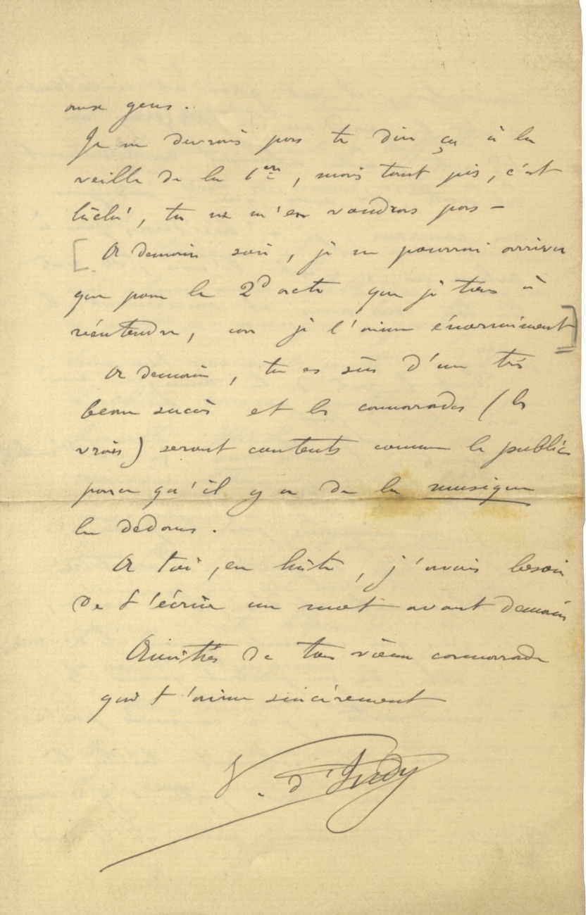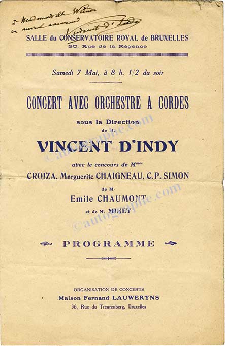 Pièce signéeDédicace autographe signée. Sans date ; 2 pages in-4°. Il s’agit du programme du concert avec orchestre à cordes sous la direction de Vincent d’Indy du samedi 7 Mai à 8 h 1/2 du soir à la salle du conservatoire Royal de...