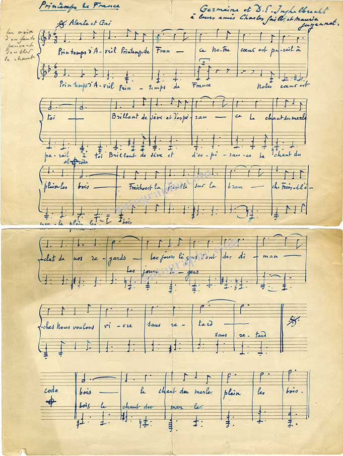 Manuscrit musical autographe signé « Printemps de France »Manuscrit musical autographe signé « Printemps de France ». Sans date ; 1 page in-folio, fendue au milieu au pli. Envoi autographe signé : « Germaine et D.E Inghelbrecht à leurs amis Charles Saille et Maurice Guyennot ». Chanson...
