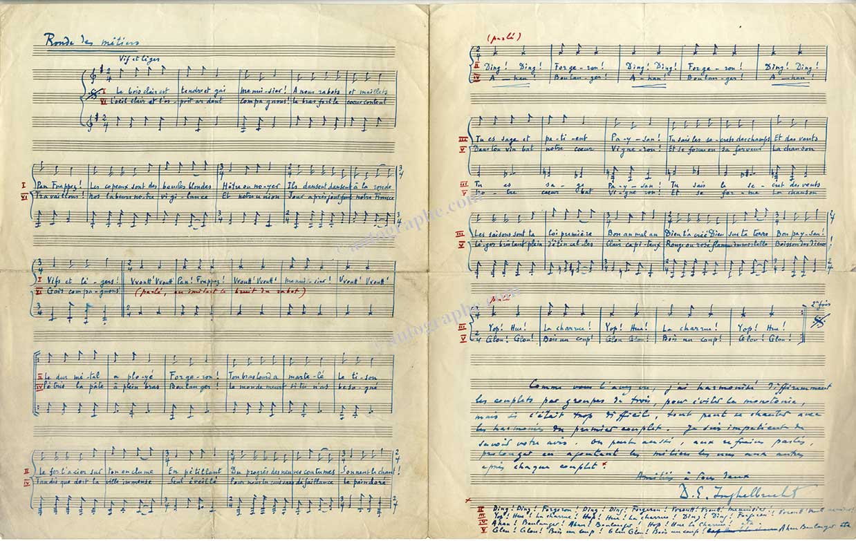 Manuscrit musical autographe signé « Ronde des Métiers ».Manuscrit musical autographe signé « Ronde des Métiers ». Sans date ; 2 pages in-folio. Chanson pour chœur d’enfants. « Voici le bois clair et gai menuisier ». À la fin de la partition, D.E Inghelbrecht ajoute : « Comme vous...