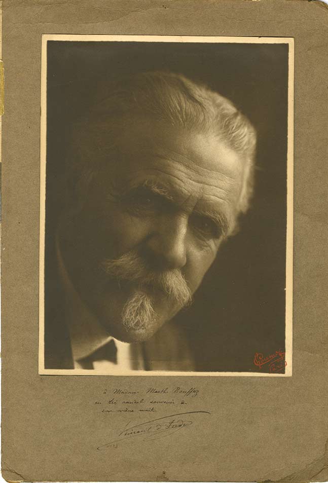 Photographie signée, dédicacée à Mme Bouffez.Photographie signée, dédicacée à Mme Bouffez. 23,7 x 17,7 cm sur un support de 33,5 x 23 cm. Beau portrait du compositeur dédicacé « à Marthe Bouffez en très amical souvenir de son vieux maître Vincent d’Indy ». Signature du...