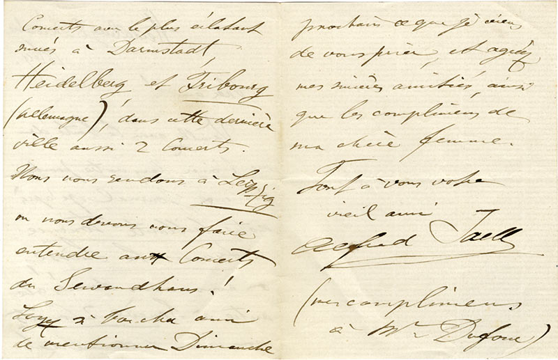 Lettre autographe signéeLettre autographe signée. Cologne, 3 février 1861 ; 4 pages in-8°. « Lhomme propose et Dieu dispose ! Une invitation avantageuse pour un concert à Aix-la-Chapelle retardera mon arrivée à Paris de quelques jours, de manière que je...