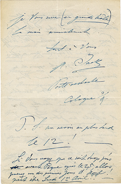 Lettre autographe signéeLettre autographe signée adressée à Jean Cras. Bofrres - Ardèche, 8 août 1916 ; 2 pages in-8°. Lettre alors qu’il est directeur de l’institution Schola Cantorum. ...