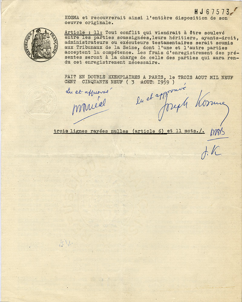 Lettre autographe signéePièce signée. Paris, 3 août 1959 ; 2 pages 1/2 in-folio. Contrat signé avec M. Breal afin de composer un opéra de sa pièce en 3 actes Les Hussards. On joint une lettre autographe signée de Mme KOSMA, épouse du compositeur Kosma ....