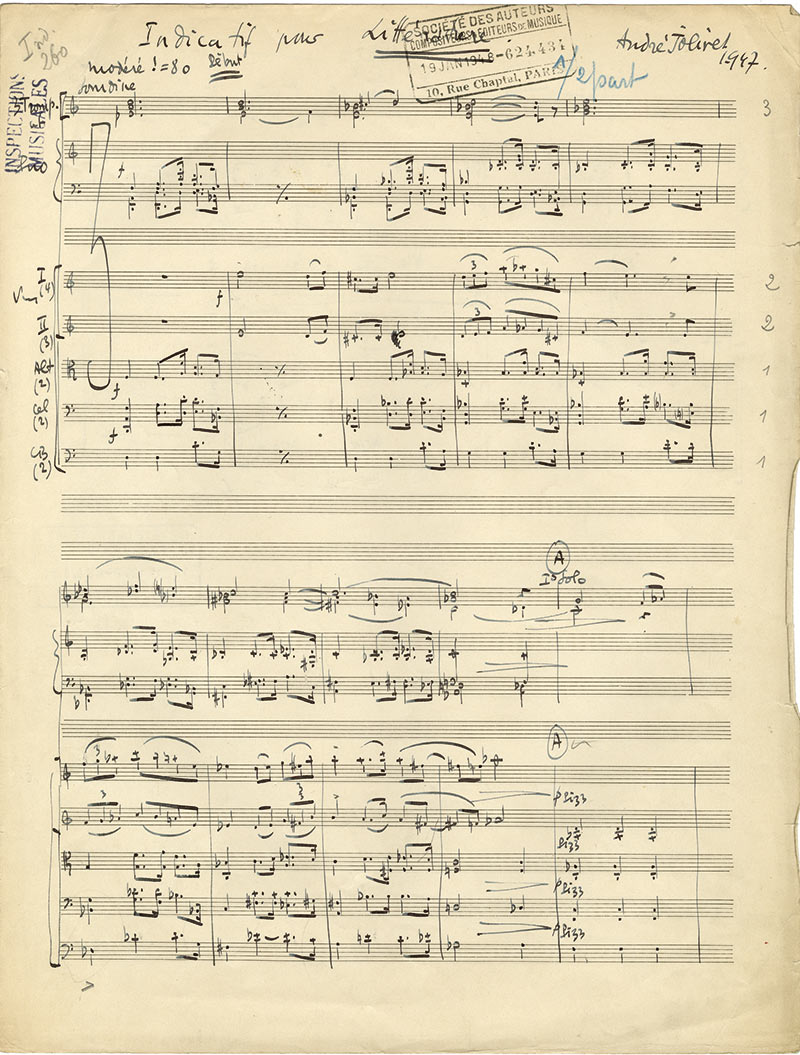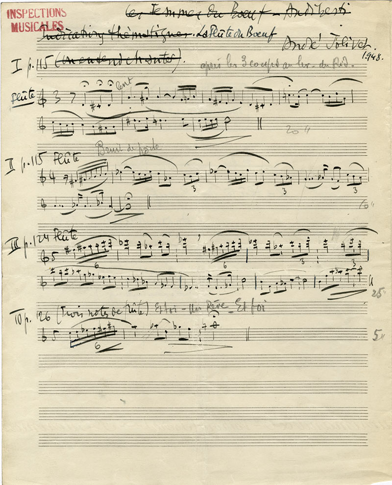 Manuscrit musical autographe signéManuscrit musical autographe signé, La Flûte du Bœuf [K142], 1948 ; titre et 2 pages in-4.Musique inédite pour flûte pour Les Femmes du Bœuf de Jacques Audiberti, créée à la Comédie Française (salle du Luxembourg), le 23...