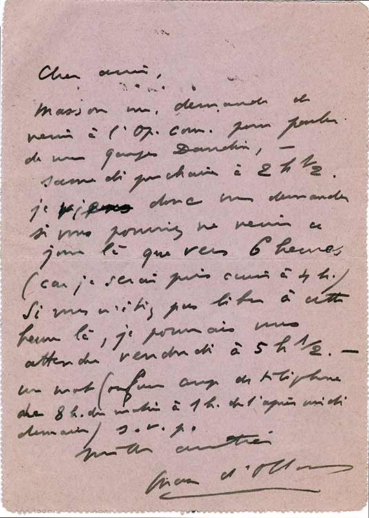 Lettre autographe signéeLettre autographe signée, adressée à Georges Favre. Paris, 27 novembre 1929 ; 1 page in-12, adresse autographe timbrée. « Masson me demande de venir à l’Op. Com. […] samedi prochain. […] Je viens donc vous demander si vous...