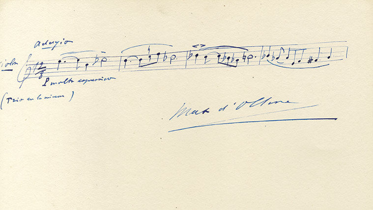 Partition autographe signéePortée musicale autographe signée. 1 page in-4°. « Trio en la mineur pour violon. »