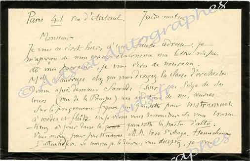 Pièce autographe signéePièce autographe signée. « Jeudi matin »; 1 page 1/2 in-8° oblongue, sur papier de deuil. « Je vous ai écrit hier à une fausse adresse : Je m’aperçois de mon erreur. […] Je vous écris de nouveau. » Il évoque une audition...