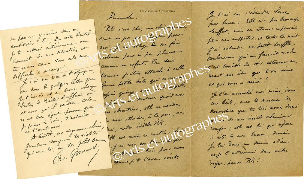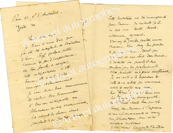 Lettre autographe signée2 lettres autographes signées, adressées à sa compagne Mathilde Tarquini d’Or. 2 et 3 pages in-8°. — « Vendredi » ; 2 pages in-8°. « Je suis bien heureux de ton succès, ma chère mignonne, je n’ai pas reçu les journaux que...