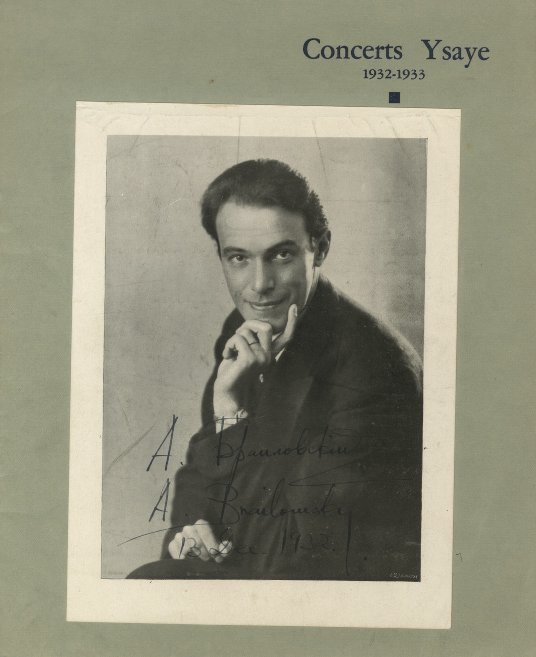 photographie dédicacéePhotographie dédicacée signée en Russe. 13 décembre 1932 ; contrecollé sur la couverture du programme des concerts Ysaye de la saison 1932-1933. Lors d’une série de concerts donnée au Palais des Beaux-Arts de Bruxelles,...